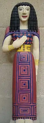 La statuette représente une jeune femme debout de face, le bras droit plié portant la main aux longs doigts contre le buste, le bras gauche tendu le long du corps avec la main plaquée contre la cuisse, et les pieds joints. Sa chevelure est coiffée en épaisses mèches nouées « en perles » qui tombent dans le dos et devant les épaules[7],[8], et complétée sur le front par une rangée de petites boucles[9]. De très grands yeux en amande et une bouche au sourire retenu éclairent le visage. La jeune femme est vêtue d'une tunique longue moulant le buste, serrée à la taille par une ceinture haute sans doute en métal[10], et enrobant le bas du corps sans faire aucun pli. La tunique porte un décor différent en haut et en bas[11] : sur le buste, un décor d'écailles ; sur les jambes, une large bande de carrés emboîtés à l'avant et en bas, et une rangée de franges. Le haut du dos et l'arrière des bras sont recouverts d'une courte cape, décorée au bord d'une file de méandres. Une bande pareillement décorée devant le cou figure peut-être une bride servant à retenir la cape[12] ; ou bien elle appartient au bord de la tunique, et la cape était alors fixée par des agrafes devant les épaules[13],[14]. On a envisagé aussi qu'il ne s'agissait pas d'une cape, mais du dos de la tunique rabattu vers l'avant[14]. Quoi qu'il en soit, elle n'est pas traitée de façon naturelle, notamment à l'arrière des bras. Les poignets étaient ornés de bracelets rendus en peinture (incisions préparatoires), et les pieds sont nus.