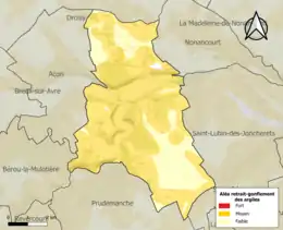 Le retrait-gonflement des sols argileux est susceptible d'engendrer des dommages importants aux bâtiments en cas d’alternance de périodes de sécheresse et de pluie. 78,2 % de la superficie communale est en aléa moyen ou fort (52,8 % au niveau départemental et 48,5 % au niveau national). Sur les 385 bâtiments dénombrés sur la commune en 2019, 311 sont en aléa moyen ou fort, soit 81 %, à comparer aux 70 % au niveau départemental et 54 % au niveau national. Une cartographie de l'exposition du territoire national au retrait gonflement des sols argileux est disponible sur le site du BRGM[20],[Carte 2].