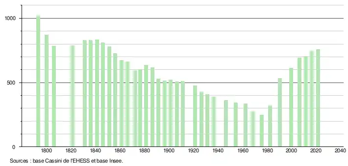 L'évolution du nombre d'habitants est connue à travers les recensements de la population effectués dans la commune depuis 1793. Pour les communes de moins de 10 000 habitants, une enquête de recensement portant sur toute la population est réalisée tous les cinq ans, les populations légales des années intermédiaires étant quant à elles estimées par interpolation ou extrapolation[25]. Pour la commune, le premier recensement exhaustif entrant dans le cadre du nouveau dispositif a été réalisé en 2006[26].