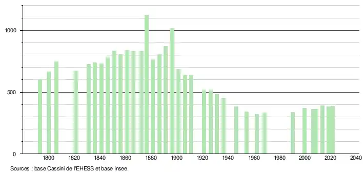 L'évolution du nombre d'habitants est connue à travers les recensements de la population effectués dans la commune depuis 1793. Pour les communes de moins de 10 000 habitants, une enquête de recensement portant sur toute la population est réalisée tous les cinq ans, les populations légales des années intermédiaires étant quant à elles estimées par interpolation ou extrapolation[17]. Pour la commune, le premier recensement exhaustif entrant dans le cadre du nouveau dispositif a été réalisé en 2008[18].