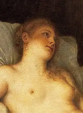 Della Casa poursuit dans la lettre en ajoutant qu'Alexandre Farnèse avait envoyé à Titien une miniature représentant la belle-sœur de la signora Camilla pour faire peindre son portrait. Mais le peintre avait eu l'idée géniale d'appliquer la tête de sa belle-sœur sur le corps de la « femme nue ». Selon Della Casa, la Danaé ne serait donc rien d'autre que le portrait nu de l'amante de Farnèse, une certaine Angela, belle-sœur de Camilla Pisana, célèbre courtisane de l'époque. Titien pourrait aussi avoir vu le portrait d'Angela sur un croquis de Giulio Clovio[3].