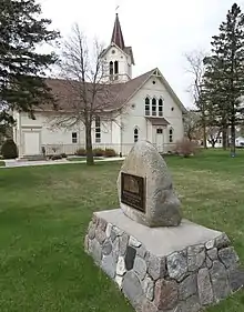 L'église luthérienne de Danebod (Danebod Lutheran Church), aussi connue sous le nom de l'église de la croix à Danebod (Cross Church at Danebod)[47], est consacrée le dimanche . Le bâtiment, cruciforme avec un bardage en bois, comprend une tour centrale à 45° des bras de la croix. Il est édifié dans un style Eastlake (en)[48]. L'église est en grande partie construite par des volontaires et grâce à l'argent des premiers habitants de Tyler. Parmi ses points d'intérêts se trouvent : les autels et leur mobilier, les lampes à kérosène, les lambris des murs et plafonds, les fenêtres en forme de hublot, l'étoile de Bethléem au plafond, la statue du Christ de Bertel Thorvaldsen, les images du narthex ainsi que les sculptures sur l'autel, le pupitre, la balustrade et les fonts baptismaux[47],[33]. L'église est aujourd'hui affiliée à l'Église évangélique luthérienne en Amérique[47],[49].