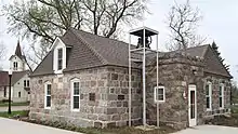 Le pavillon de pierre de Danebod (Danebod Stone Hall) est construit en 1889. Il s'agit d'un bâtiment en pierre d'un seul étage prenant la forme d'une croix latine. L’aile d'entrée comprend des créneaux d'inspiration médiévale mais la plupart de ses ouvertures se rapprochent davantage du style Greek Revival[48]. La pavillon est construit à partir de pierres extraites par des fermiers locaux et travaillées par le tailleur de pierre danois Kristian Klink. L'édifice est utilisé comme une église, puis un gymnase et une salle de réunion. Ses points d'intérêts incluent l'ancienne cloche à l'extérieur du bâtiment, la fresque du gymnase, l'ancienne chandelier de l'église luthérienne et les pierres taillées à la main de la structure[34]. Le pavillon est aujourd'hui un musée regroupant des photographies, écrits et objets de l'histoire de Danebod. Elle sert également de salle de réunion pour plusieurs activités[50].