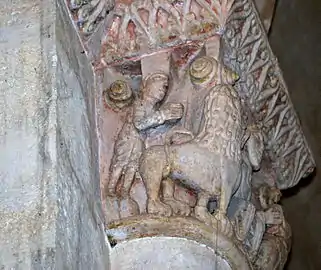 Par contre, il existe beaucoup de chapiteaux qui sont des parodies de « Daniel dans la fosse aux lions ». On y voit un homme, soit nu, soit habillé richement, entre deux lions ; les pieds posés, parfois enfoncés, sur leurs flancs : les mains plongées dans leurs gueules. Ces personnages sont le contraire de Daniel, homme pieux qui aspire à un état d'ataraxie. Ces hommes cherchent à faire le lien avec l'animalité en étant au contact avec les lions, qui sont des êtres démoniaques ; on trouve parfois des signes de luxure, lorsque ces hommes sont nus et ithyphalliques ; d'orgueil ou de vanité quand ils sont « trop bien habillés ».