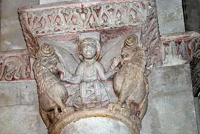 On trouve de nombreux chapiteaux, comme celui de l'Abbaye de La Sauve-Majeure, où un homme dans une position plutôt acrobatique est dévoré par des monstres. Évidemment la représentation n'a rien à voir avec Daniel.