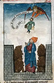 - Chapitre XIV[2] Le second épisode (apocryphe dans le canon juif et protestant) a eu lieu quelques années plus tard, sous le règne de Cyrus le Jeune. Il raconte la délivrance miraculeuse de Daniel, jeté dans la fosse aux lions pour avoir tué le dragon vénéré par les Babyloniens.
