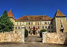 - Le château de Dardagny (classé Bien Culturel d'importance nationale)[17], avec sa salle des chevaliers baroque ainsi qu'une imposante balustrade, abrite mairie et école ; il est le plus grand du canton de Genève, reconstruit en 1723 par Jean Vasserot. De plan rectangulaire, il comporte une façade monumentale à fronton de style classique et est flanqué aux angles de quatre tours carrées, seuls vestiges d'une construction antérieure de 1655[18].
