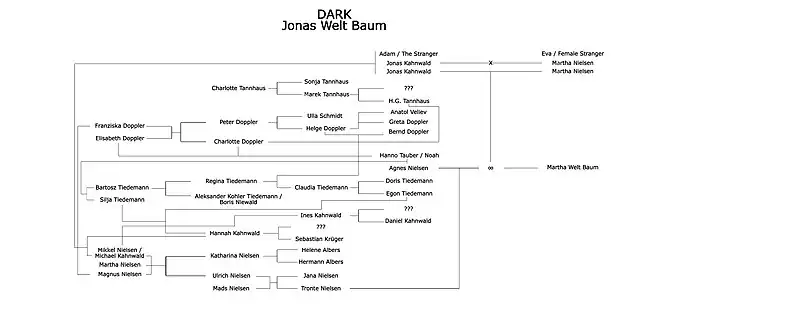 - Agnes Nielsen : la grand-mère d’Ulrich, fille de Bartosz et Silja, sœur de Noah, petite fille d'Hannah, Egon, Regina et Aleksander, nièce de Jonas et Claudia et en même temps arrière-petite-fille de Claudia, mère de Tronte (à la suite de sa relation avec l'Origine), tante de Charlotte Doppler, amante de Doris Tiedemann en 1953