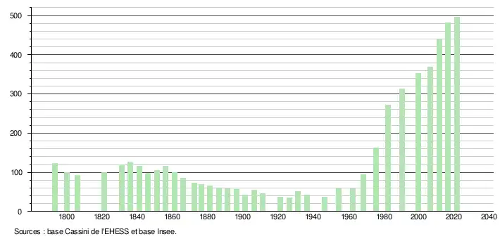 L'évolution du nombre d'habitants est connue à travers les recensements de la population effectués dans la commune depuis 1793. Pour les communes de moins de 10 000 habitants, une enquête de recensement portant sur toute la population est réalisée tous les cinq ans, les populations légales des années intermédiaires étant quant à elles estimées par interpolation ou extrapolation[13]. Pour la commune, le premier recensement exhaustif entrant dans le cadre du nouveau dispositif a été réalisé en 2006[14].