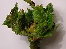 La galle cause des rosettes[4] sur son hôte en inhibant le développement des pousses. La rosette est formée de 8 à 40 (ou plus encore) feuilles fines déformées avec des pétioles extrêmement réduits.
