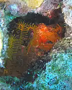Ces bras, longs de 10 à 40 cm (mais en grande partie dissimulés dans la cachette), sont au nombre de 20 à 35[3], et leur extrémité est le plus souvent enroulée en crosse. La couleur en est très variable, mais la forme la plus classique porte un rachis noir et des pinnules jaune orangé; cependant le rachis peut être coloré, et les pinnules peuvent aller de vert à brun (mais jamais blanc)[4].