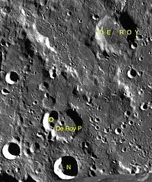 Les cratères dit satellites sont de petits cratères craterlets situés à proximité du cratère principal, ils sont nommés du même nom mais accompagné d'une lettre majuscule complémentaire (même si la formation de ces cratères est indépendante de la formation du cratère principal). Par convention ces caractéristiques sont indiquées sur les cartes lunaires en plaçant la lettre sur le point le plus proche du cratère principal. Liste des cratères satellites de De Roy :
