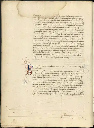 Le principe de base était décrit par Leon Battista Alberti : les rayons lumineux provenant d'une scène forment des lignes droites à partir des points de la scène jusqu'à l’œil de l'artiste. Ils forment une sorte de pyramide, avec l’œil placé à l'apex. Le tableau de l'artiste doit représenter une section de cette pyramide coupée par un plan. L'application de ce principe constitue la majeure partie du traité.