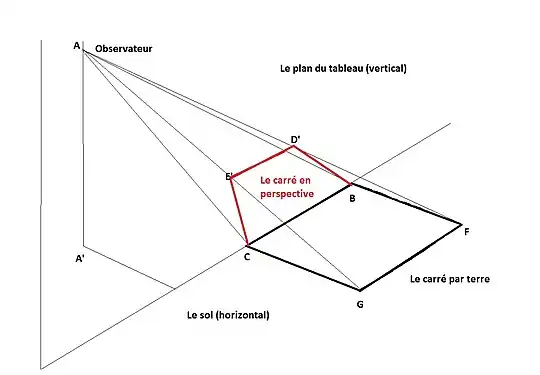 Le principe du dessin en perspective est de tracer des lignes droites entre chaque point du carré et l’œil de l'artiste. Les points d'intersection de ces lignes avec le plan du canevas donne la représentation du carré , vu par l'artiste.