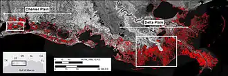 - la chenalisation du fleuve et son endiguement ; alors que le substrat argileux naturel et les apports majoritairement argilovaseux ne favorisent pas le méandrage du fleuve, sa chenalisation a fortement limité les apports sédimentaires sur les côtés du cours d'eau, et ils favorisent l'expulsion des sédiments dans le golfe du Mexique ; L’endiguement anti-inondation semble avoir paradoxalement fait augmenter le niveau général de l'eau et des crues (de 1930 à 1990 alors que l’on creusait des canaux de drainage sans porte à la mer (ce qui a changé depuis Katrina), environ 16 % des zones autrefois marécageuses sont devenues des zones de pleine eau permanente[16], et dans les années 1970, jusqu'à 50 miles carrés de zones humides se sont enfoncées sous le niveau de l'eau chaque année). Ces travaux semblent avoir aggravé les risques futurs, alors que l'urbanisation a été poursuivie, malgré les risques[17] et que certains se demandent s'il ne vaudrait pas mieux parfois ne pas reconstruire[18].