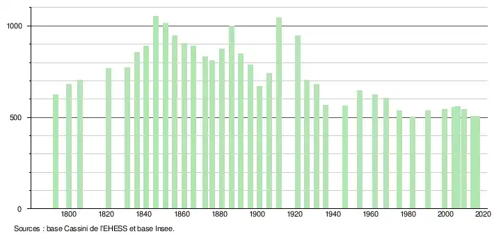L'évolution du nombre d'habitants est connue à travers les recensements de la population effectués dans la commune depuis 1793. Pour les communes de moins de 10 000 habitants, une enquête de recensement portant sur toute la population est réalisée tous les cinq ans, les populations légales des années intermédiaires étant quant à elles estimées par interpolation ou extrapolation[2]. Pour la commune, le premier recensement exhaustif entrant dans le cadre du nouveau dispositif a été réalisé en 2004[3].