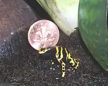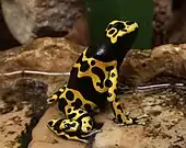Dendrobates leucomelas est une espèce d'amphibiens de la famille des Dendrobatidae[2]. L'origine du nom du genre Dendrobates dérive des termes grecs dendros qui signifie « arbre » et bates qui veut dire « grimpeur », faisant référence au comportement de certains amphibiens de la famille des Dendrobatidae aux mœurs très arboricoles[7]. L'épithète leucomelas provient du grec, leuco et melan signifiant respectivement « blanc » et « noir ». Il se réfère au contraste dû aux bandes jaunes et noires présentes sur le corps de cette grenouille[8].