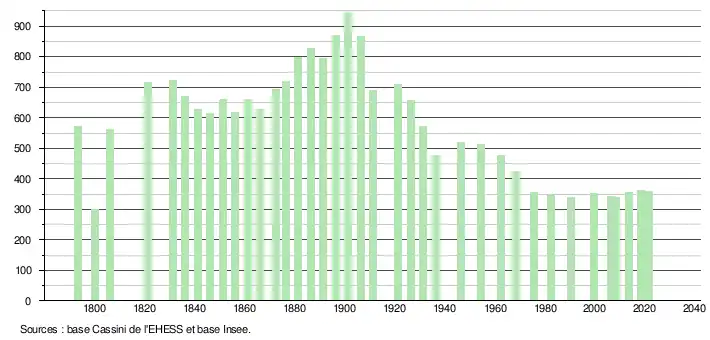 L'évolution du nombre d'habitants est connue à travers les recensements de la population effectués dans la commune depuis 1793. Pour les communes de moins de 10 000 habitants, une enquête de recensement portant sur toute la population est réalisée tous les cinq ans, les populations légales des années intermédiaires étant quant à elles estimées par interpolation ou extrapolation[18]. Pour la commune, le premier recensement exhaustif entrant dans le cadre du nouveau dispositif a été réalisé en 2008[19].