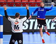 Denis Buntić à l'échauffement face à son coéquipier du SC Pick Szeged Marin Šego, le 29 avril 2017.