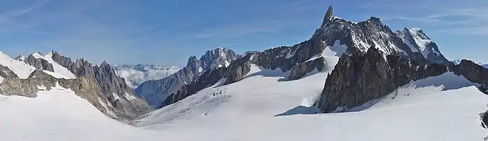 Panorama de l'aiguille du Midi, avec la dent du Géant sur la gauche.