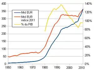 Le tableau suivant fournit les données sur la dette au 31 décembre de chaque année, au sens de Maastricht (règlement n° 3605 de la Commission Européenne[6]), en milliards d’euros courants et constants (base 2011) et en pourcentage du produit intérieur brut.