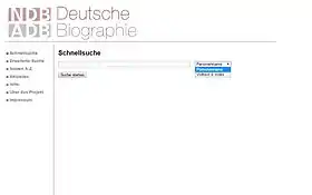 À la suite de la phase d'expansion de 2012 à 2014, "la présence en ligne étendue et mise à jour" de Deutsche Biographie est activée en décembre 2014 avec environ 268 000 entrées[3]. Entre autres choses, tous les noms sont comparés et liés au Gemeinsame Normdatei (GND).