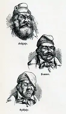 Son attribut le plus frappant est son bonnet de nuit ou bonnet pointu[N 1] Les premières représentations picturales d'un Michel datent de la première moitié du 19e siècle. Sa forme picturale fait référence à des prédécesseurs littéraires ou à une compréhension populaire de la figure. Le Michel a atteint le véritable sommet de sa popularité dans les années 1840.