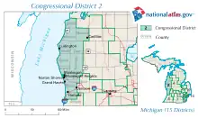 Le 2e district congressionnel est associé à la région riveraine du centre-nord du lac Michigan depuis le redécoupage de 1992. Il y a eu quelques changements, mais cela couvre toujours en général le même domaine.
