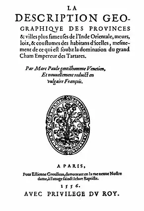 - Les Voyages de Marco Polo est le titre de l'édition de Ramusio (1559), adopté ensuite par la plupart des traductions anglaises depuis Frampton (1579)[61], ainsi que par l'édition de la Société de géographie (1824). — Ce titre a le défaut de représenter Marco Polo en ‘voyageur’, alors qu'il était un officiel en mission.