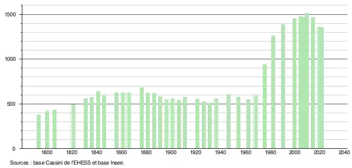 L'évolution du nombre d'habitants est connue à travers les recensements de la population effectués dans la commune depuis 1793. Pour les communes de moins de 10 000 habitants, une enquête de recensement portant sur toute la population est réalisée tous les cinq ans, les populations légales des années intermédiaires étant quant à elles estimées par interpolation ou extrapolation[20]. Pour la commune, le premier recensement exhaustif entrant dans le cadre du nouveau dispositif a été réalisé en 2004[21].