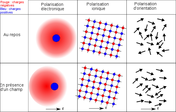Cette polarisation provient trois effets physiques différents. Ils sont représentés ici, chacun étant très exagéré :