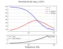 étant la fréquence angulaire. Dans cette écriture, est la permittivité à l'infini (en très haute fréquence), elle est réelle et correspond à la situation où les dipôles ne sont plus du tout mobiles. est la permittivité statique, c'est-à-dire observée en très basse fréquence, lorsque les dipôles réagissent en régime forcé. Dans la zone de transition, la partie imaginaire de la permittivité devient importante, traduisant des pertes : de l'énergie est perdue à déplacer les dipôles.