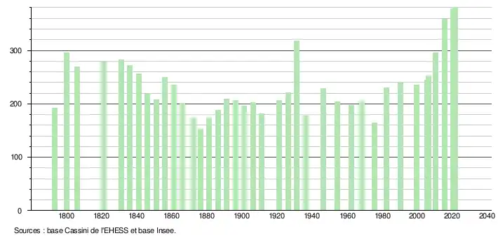 L'évolution du nombre d'habitants est connue à travers les recensements de la population effectués dans la commune depuis 1793. Pour les communes de moins de 10 000 habitants, une enquête de recensement portant sur toute la population est réalisée tous les cinq ans, les populations légales des années intermédiaires étant quant à elles estimées par interpolation ou extrapolation[14]. Pour la commune, le premier recensement exhaustif entrant dans le cadre du nouveau dispositif a été réalisé en 2005[15].