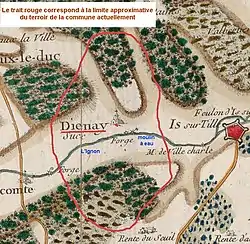 La carte de Cassini ci-dessus montre qu'au XVIIIè siècle, Diénay est une Paroisse située sur la rive gauche de la rivière L'Ignon.
