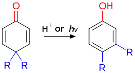 Les diénones sont notamment connues à travers les réarrangements diénone-phénol au cours desquels une diénone hexacyclique substituée est réarrangée en phénol sous l'action d'un acide ou de la lumière[1] :