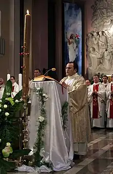 Diacre chantant l'exultet lors de la vigile pascale.