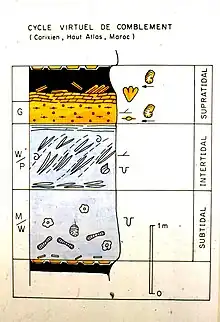 - la cimentation précoce, à la surface de la zone supratidale ou côtière, dans le cas d'une plate-forme « bahamienne », comme la vaste plate-forme carbonatée ancienne du Lias moyen au Maroc (Haut Atlas, Moyen Atlas, rides sud rifaines etc.) soit env. 200 x 300 km[2]. La plate-forme carbonatée s'étend en Algérie et en Tunisie jusqu'en Oman, le long de la marge sud-téthysienne. Un bon exemple actuel de sédimentation et de diagenèse est donné par les dépôts côtiers (de marée et de tempêtes) platiers et « chotts » (sédimentaton cyclique) du fond du golfe de Gabès en Tunisie[3].