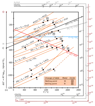Le diagramme d'Ellingham représente la variation d'enthalpie libre standard de formation d'un oxyde à partir d'un métal ou d'un oxyde inférieur en fonction de la température. L'équation bilan est ramenée à la consommation d'une mole de dioxygène, même si d'autres coefficients sont fractionnaires. Pour la formation de l'oxyde du chrome (III) par exemple, les données réfèrent à l'équation