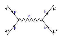 Plus généralement, l'électrodynamique quantique traite des interactions entre les particules chargées (ce qui inclut les électrons et leurs antiparticules, les positrons) et le champ électromagnétique (dont les vecteurs de force sont les photons) ; dans les diagrammes de Feynman, l'électron est représenté avec une flèche qui va dans le sens du temps, le positron avec une flèche qui va dans le sens contraire, et le photon avec une ligne ondulée[Note 7],[30].