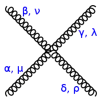 En 1968, Richard Feynman montre que ses diagrammes peuvent aussi s'appliquer à l'interaction forte, ils permettent donc de décrire la chromodynamique quantique en ajoutant de nouvelles règles. Le processus fondamental analogue à la réaction électron-photon de l'électrodynamique est alors la réaction quark-gluon, dans laquelle la charge de couleur est conservée (mais pas la saveur). Les gluons portant comme les quarks des charges de couleur (contrairement aux photons qui sont neutres) il existe des vertex impliquant uniquement des gluons[33] :