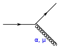 L'étude des interactions fortes avec les diagrammes de Feynman est possible grâce à la propriété de liberté asymptotique qui permet d'appliquer la théorie des perturbations aux quarks et aux gluons : à très faible distance cette interaction devient faible[34],[35]. On définit alors la constante de couplage de l'interaction forte pour un vertex, notée , équivalent de la constante de structure fine en électrodynamique quantique. La difficulté en chromodynamique quantique vient du fait que les quarks sont fortement influencés par les forces non perturbatives. En se plaçant à des niveaux d'impulsion très grands, où le couplage est faible, la valeur de obtenue permet de calculer le résultat de processus de diffusion à haute énergie[36].
