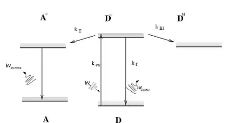 Un Diagramme de Perrin-Jablonski, nommé d'après les physiciens français et polonais Francis Perrin et Alexandre Jabłoński, représente les états électroniques d'une molécule et les transitions entre ces états. L'axe vertical indique le niveau d'énergie, tandis que les états sont groupés horizontalement selon leur multiplicité de spin. Les transitions radiatives sont symbolisées par des flèches droites tandis que les non-radiatives le sont par des flèches ondulées. L'état vibrationnel fondamental de chaque état électronique est représenté par une ligne épaisse et les autres états vibrationnels par une ligne fine.