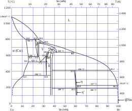 - pour les différentes phases solides, on peut reconnaître les différentes phases cristallines par diffraction de rayons X ; on peut faire l'analyse sur l'échantillon chaud, ou tremper l'échantillon, c'est-à-dire lui faire subir un refroidissement rapide afin qu'il conserve sa structure d'équilibre à chaud même lorsqu'il est froid (il n'est donc pas à l'équilibre).