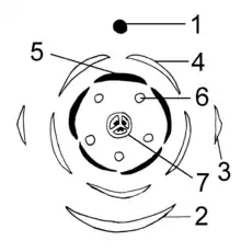 Les différentes pièces florales sont schématisées en position anatomique comme pour une coupe transversale de la fleur de l'extérieur vers l'intérieur (les numéros correspondent au dessin ci-contre) :