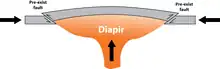 En géologie, un diapir (du grec diapeirein, « percer au travers », terme inventé en 1907 par le géologue roumain Ludovic Mrazek (en) pour décrire ce type de formation salifère dans les Alpes[1]) est un type d'intrusion impliquant une structure plus ou moins globuleuse, résultant de la remontée de roches plus légères à travers des roches plus denses. Il peut s'agir de diapir salifère (évaporites de type sel gemme, gypse), diapir granitique (magmas en fusion peu denses), diapir asthénosphérique (remontée de l’asthénosphère sous les zones en extension par l’effet de l’amincissement), diapir mantellique (autre nom des panaches). Les grands dômes de la planète naine Cérès pourraient correspondre à des diapirs de glace[2].