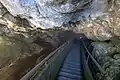 La visite se poursuit en remontant un long escalier de fer à côté de la chute d'eau. On débouche au-dessus de l'abîme le long de la route.