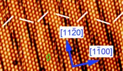 ![]() __ Zr2+ __ B3− ![]() Image STM de la surface reconstruite (2×2, orientation 0001) de ZrB2[1] |