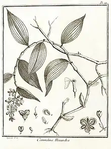 Planta perennis, caules plures, nodoſos, flexuoſos, tripedales, & amplius, ſupra frutices ſparſos, e radice emirrens. Folia alterna, ovata, ſubpetiolata, acuta, ſtriata, integerrima ; petiolo vaginam oblongam, ventricoſam, pilis coronatam, efFormante. Flores ramoſi terminates; racemulis quadrinoris, ad baſim sou amula munitis. Perianthium tripartitum, laciniis ovatis, concavis, marginibus cæruleis, perſiſtens. Corolla ; petala tria, inæqualia, cærulea, ovata, concava, calice majora, intra diviſiiras calici inſerta. Stamina : filamenta ſex, breviſſima : anthers oblongæ, bilocularæ, ferl'îles, utrinque marginatar, tnargine membranaceo, reflexo, violaceo. Pistillum : gernicn ovatum, trigonum. Stylus longus, ſtriatus. Stigma ſubrotundum.