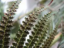 Les grandes frondes, vert foncé, peuvent être bipennées ou tripennées ; elles sont nombreuses et mesurent de 2 à 4 m de longueur[1]. Les frondes sont portées en groupes avec des frondes fertiles et stériles souvent en alternance dans les couches.