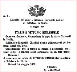Le , à Salemi, Garibaldi déclare qu'il assume la dictature de la Sicile « au nom de Victor Emmanuel, roi d'Italie »[2]. Toute l'initiative de Garibaldi était basée sur la devise « L'Italie et Vittorio Emanuele » ; cette phrase et l'établissement de la dictature au nom du roi[3] indiquent que Garibaldi avait compris que le succès de l'expédition serait facilité en maintenant des relations avec le royaume de Sardaigne et en montrant qu'il ne voulait pas provoquer des subversions de l'ordre social qui inquiéteraient les nations européennes et la bourgeoisie du Sud.